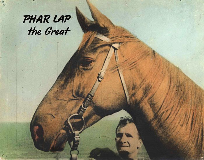 Phar Lap pictured with his good mate and strapper-cum-trainer Tommy Woodcock. This lobby card from Phar Lap's Last Race: At Agua Caliente USA (1938) refers to the horse as 'Phar Lap the Great'.