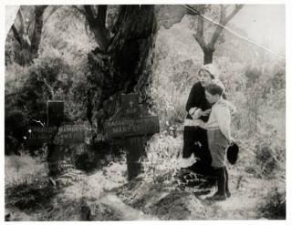 The lost 1916 Australian silent movie The Pioneers is known only from contemporary descriptions and a few stills such as this one, probably from the closing scenes of the film. It shows Deirdre, played by Alma Rock Phillips, and a boy contemplating the graves of pioneers Donald and Mary Cameron.