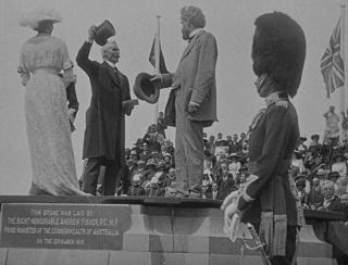 The prime minister leads the cheers at the Naming of Canberra ceremony