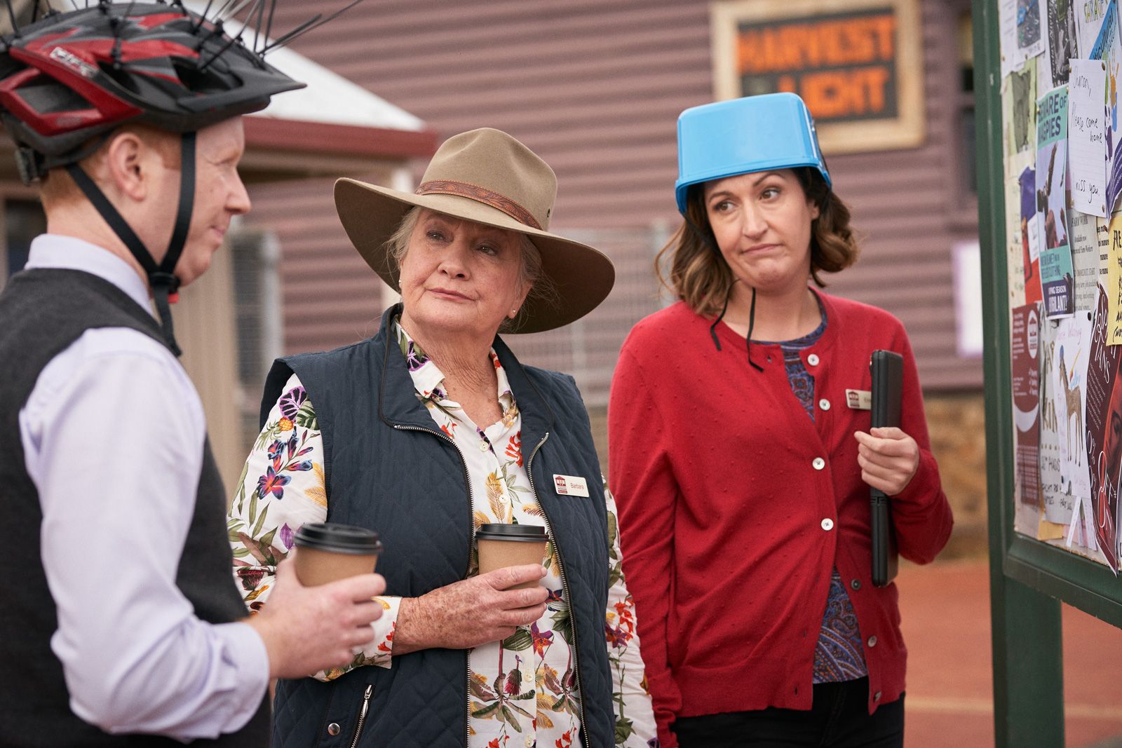 Production still from series 5 of Rosehaven with Luke McGregor, Kris McQuade and Celia Paquola.