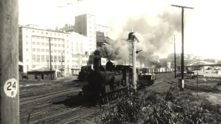 Image from the documentary Steam on the Harbour: Darling Harbour's working trains. The still shows a steam train at the Pyrmont power station. The documentary showcasing Darling Harbour as a busy railway goods yard, long before it became one of Sydney's main destinations for recreation and entertainment. It features footage shot by transport enthusiast and cinematographer Roger McKenzie and his friend Bernie Kent in the 1960s and 70s.