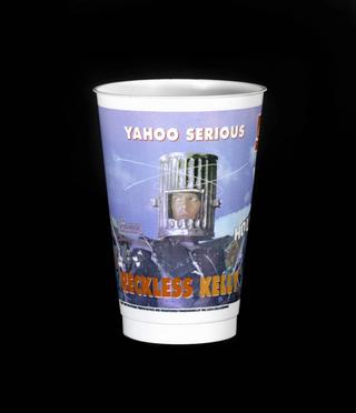 Promotional cups like this one play a part in generating buzz for the threatrical release of a film. They can be sold in cinemas – when you buy popcorn or soft drink – or as collectible merchandise in shops. This promotional cup is for the 1993 film Reckless Kelly and features an image of actor-filmmaker Yahoo Serious sporting a garbage bin in place of the familiar Ned Kelly helmet. Having its own merchandise shows how popular the film was at the time.
