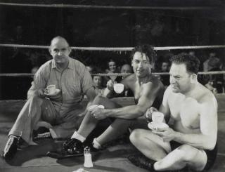 Referee Jim McMaster, Charles Farrell and professional wrestler Jack Clarke in a production still from The Flying Doctor (1936)