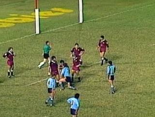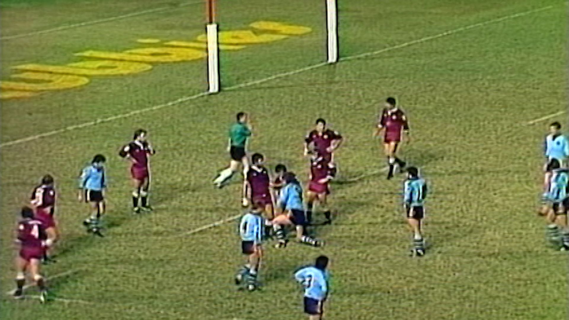 The zero-metre defensive line inherited from rugby union can be seen in this footage. It was was extended to three metres in the 1950s and then to five metres in the 1960s. In 1993 (mid-season), the reference point for measuring the defensive line at the play-the-ball was changed to where the ball is placed on the ground rather than the back foot of the marker, and the defensive line was extended to 10 metres. In 1997 striking at the ball in the play-the-ball was banned.