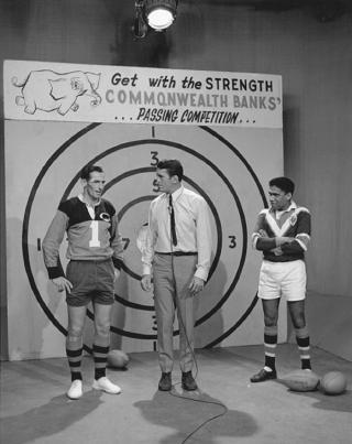 The set of The Rugby League Show, with Rex ‘Moose’ Mossop as the host, Mick Maher to his right and Bruce ‘Lapa’ Stewart on his left. Along with the famous ‘Controversy Corner’ segment, a feature of The Rugby League Show was the passing competition sponsored by the Commonwealth Bank. The bank’s elephant logo formed the bullseye of the target; if you managed to pass the ball successfully through the bullseye you scored 10 points and triggered the sound of an elephant trumpeting. The highest point scorer was awarded a range of gifts including a Pelaco shirt, a Meapro ham and Patra fresh orange juice.