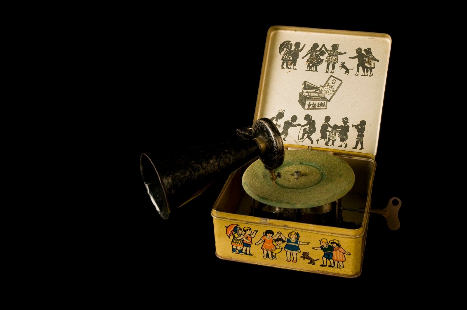 This square tin portable gramophone was made for children. It includes a black horn, green felt platter and a wind-up key.