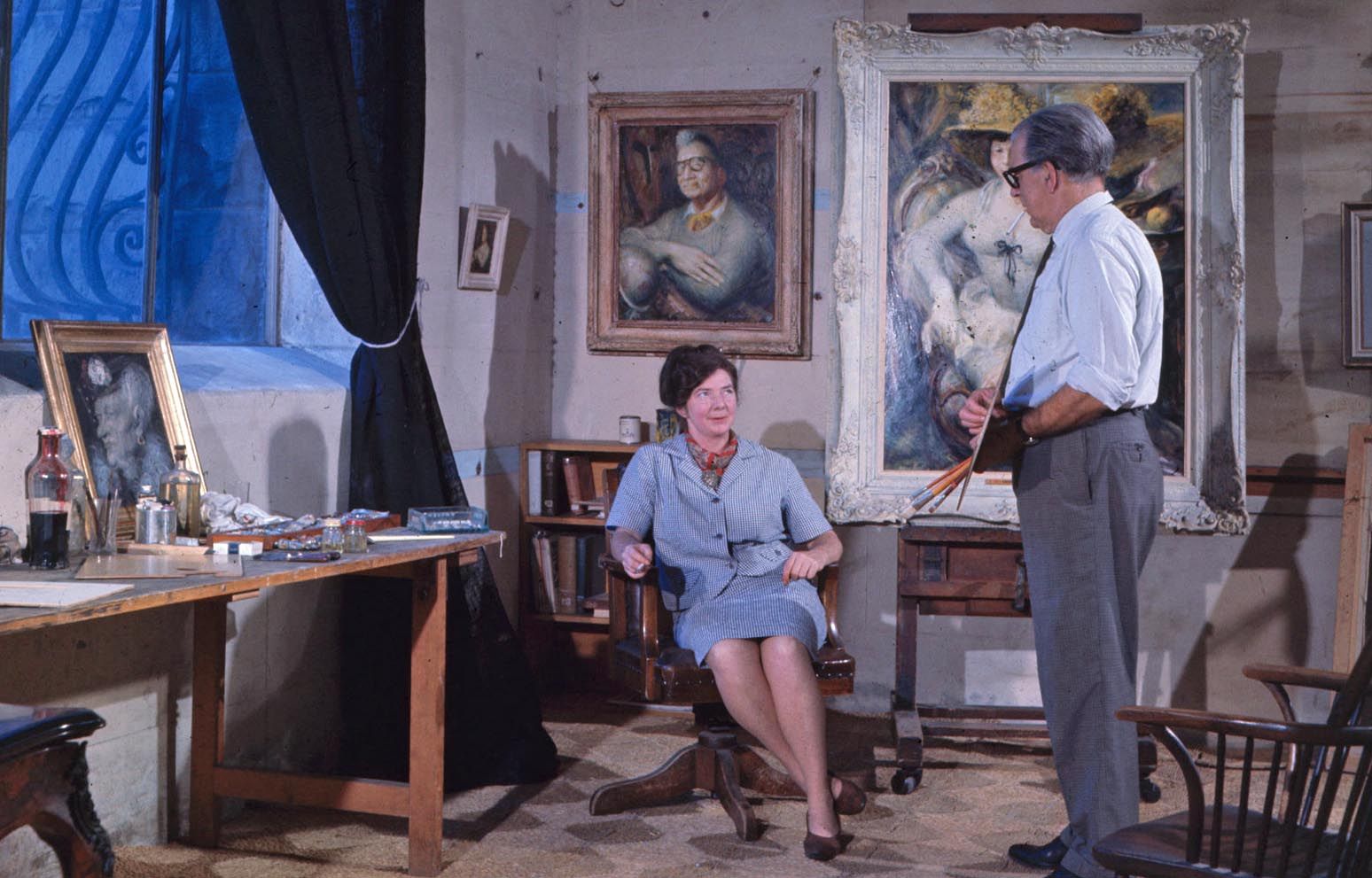 British art historian Sir Kenneth Clark presents a speech in honour of Sidney Nolan at his Retrospective exhibition opening at the Royal Dublin Society, Dublin, 1973. Clark announces Nolan as 'a great painter … he started life with a desire to be a poet, to be the Australian Rimbaud'.