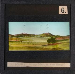 This slide shows the sixth of six sections of the painting titled Cycloramic View of Canberra Capital Site, View Looking from Camp Hill, created by Robert Charles Coulter on 2 January 1911.