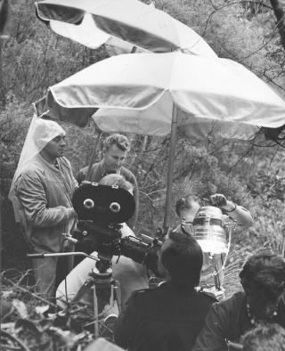 Rain brings problems for crew on location in Waratah National Park, during filming of the Skippy episode Cage of Koalas. Obscured by camera is German star Elke Neidhart and behind her director Eric Price.