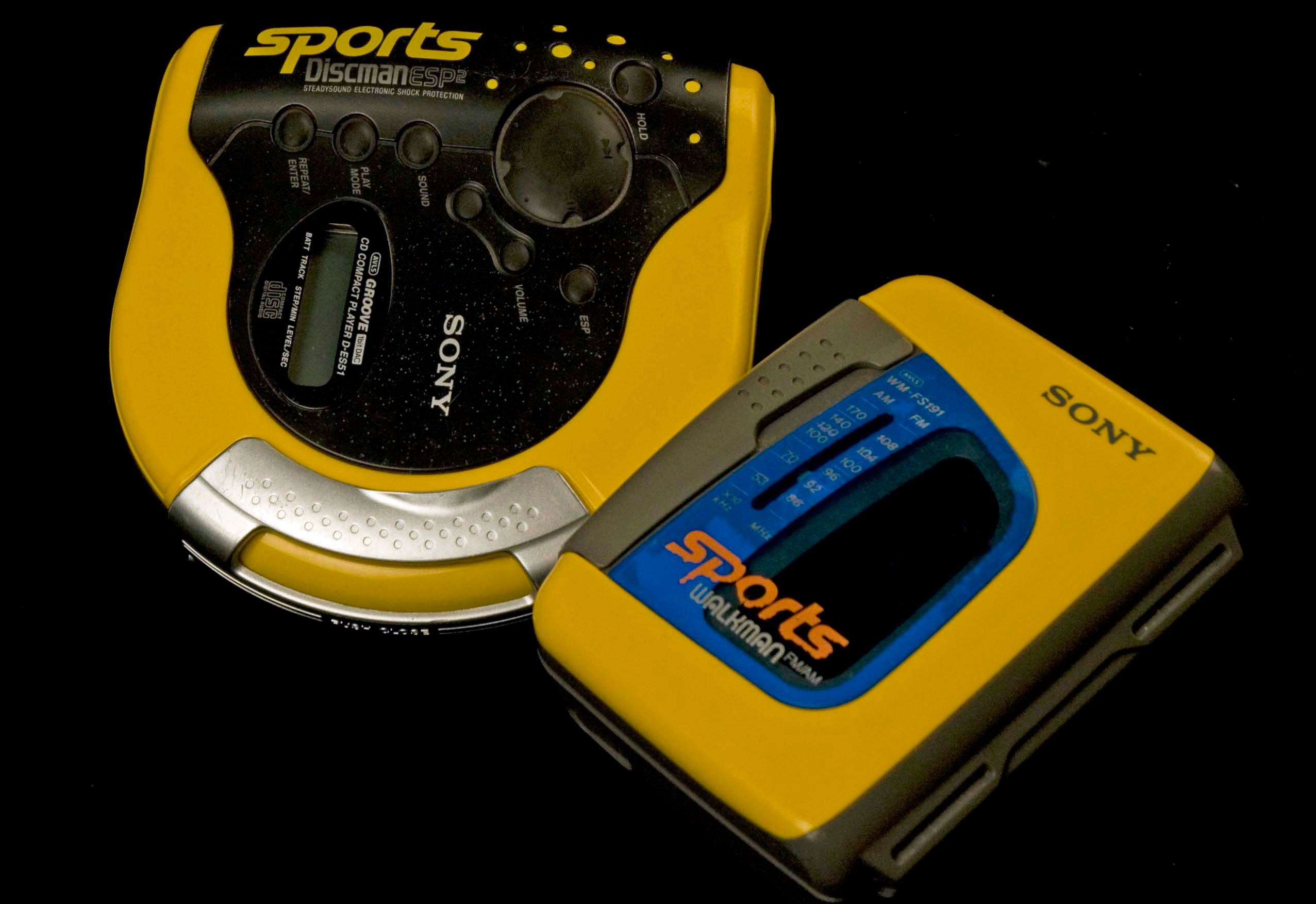 Yellow sports Walkman and Discman. The Discman says on it ;'AVLS (Automatic Volume Limiter System) Groove CD Compact Player'.