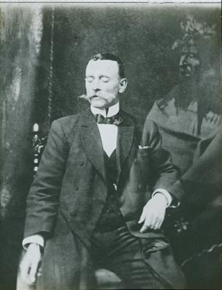 This glass slide shows a man sitting on a chair with his eyes closed and a spirit partly superimposed over his left arm and chest.