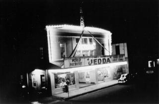 The Star Theatre in Darwin at night. The cinema billboard advertises the world premiere of Charles Chauvel's Jedda, starring Ngarla Kunoth and Robert Tudawali, in January 1955.