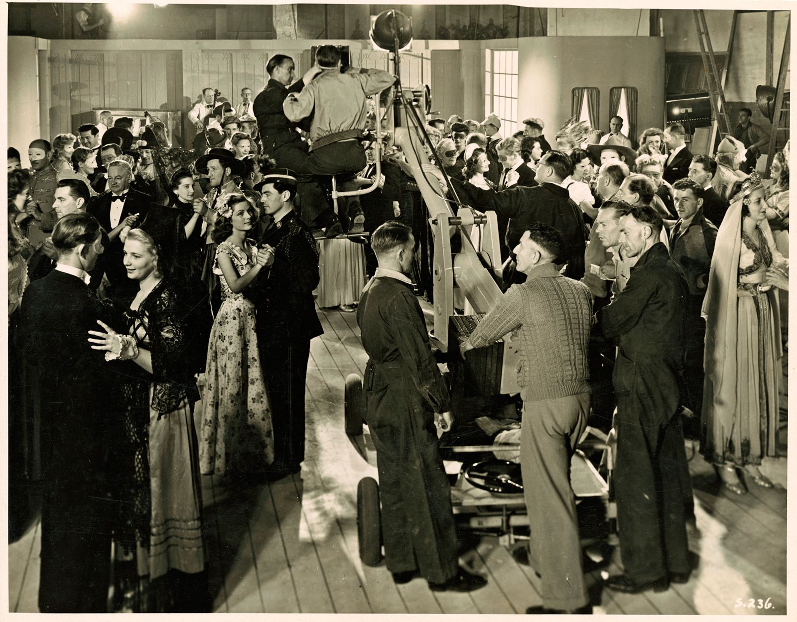 SMITHY : [PRODUCTION SHOT SHOWING MANY PEOPLE DANCING AT A MASQUERADE BALL, CAMERA AND CREW FILMING, SUSPENDED FROM MOBILE CRANE AND FOUR CREW AROUND CRANE BASE]