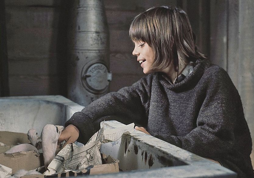Pelican trainer Gordon Noble on the set of Storm Boy with two pelicans he trained from birth for the film.
