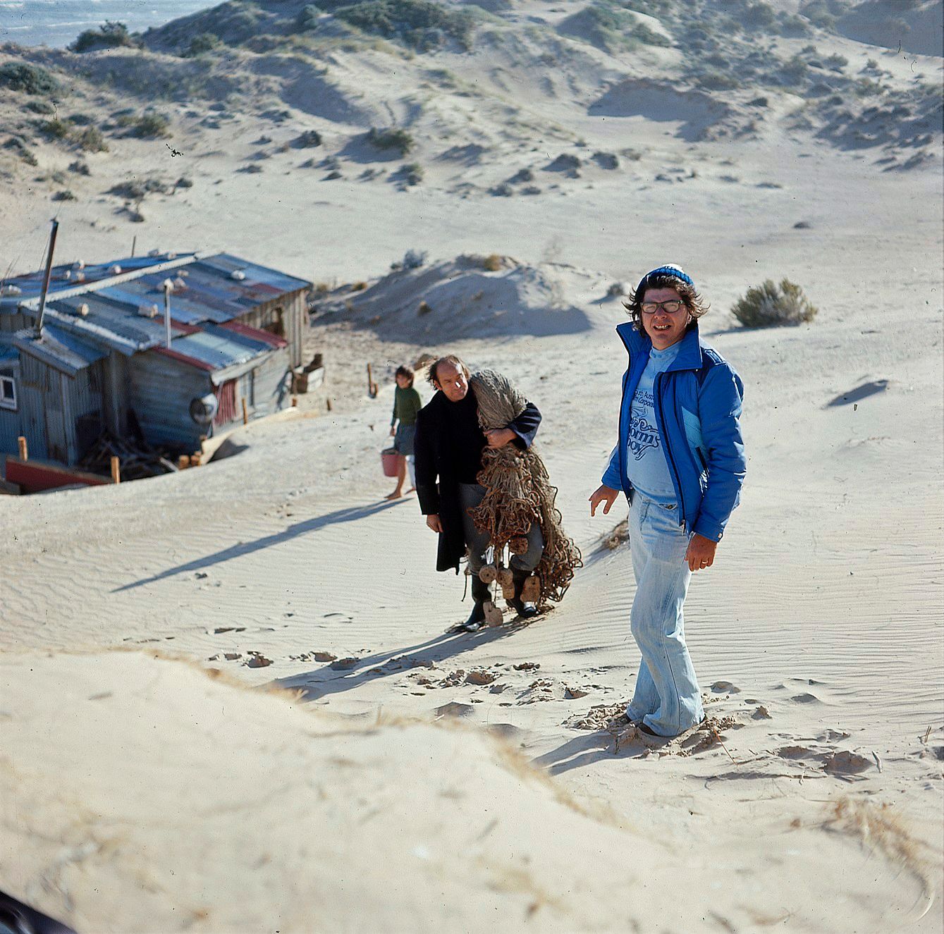 Henri Safran standing in the sand dunes with actor Peter Cummins (Hide-Away Tom) on the outdoor set of Storm Boy.