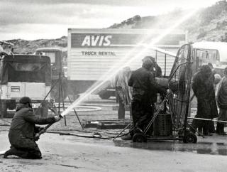 Crew film outside of the humpy on the set of Storm Boy.