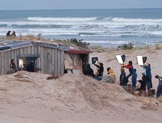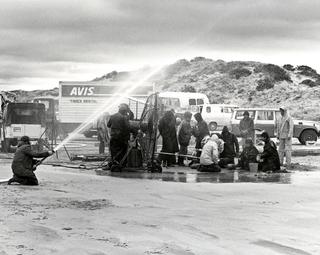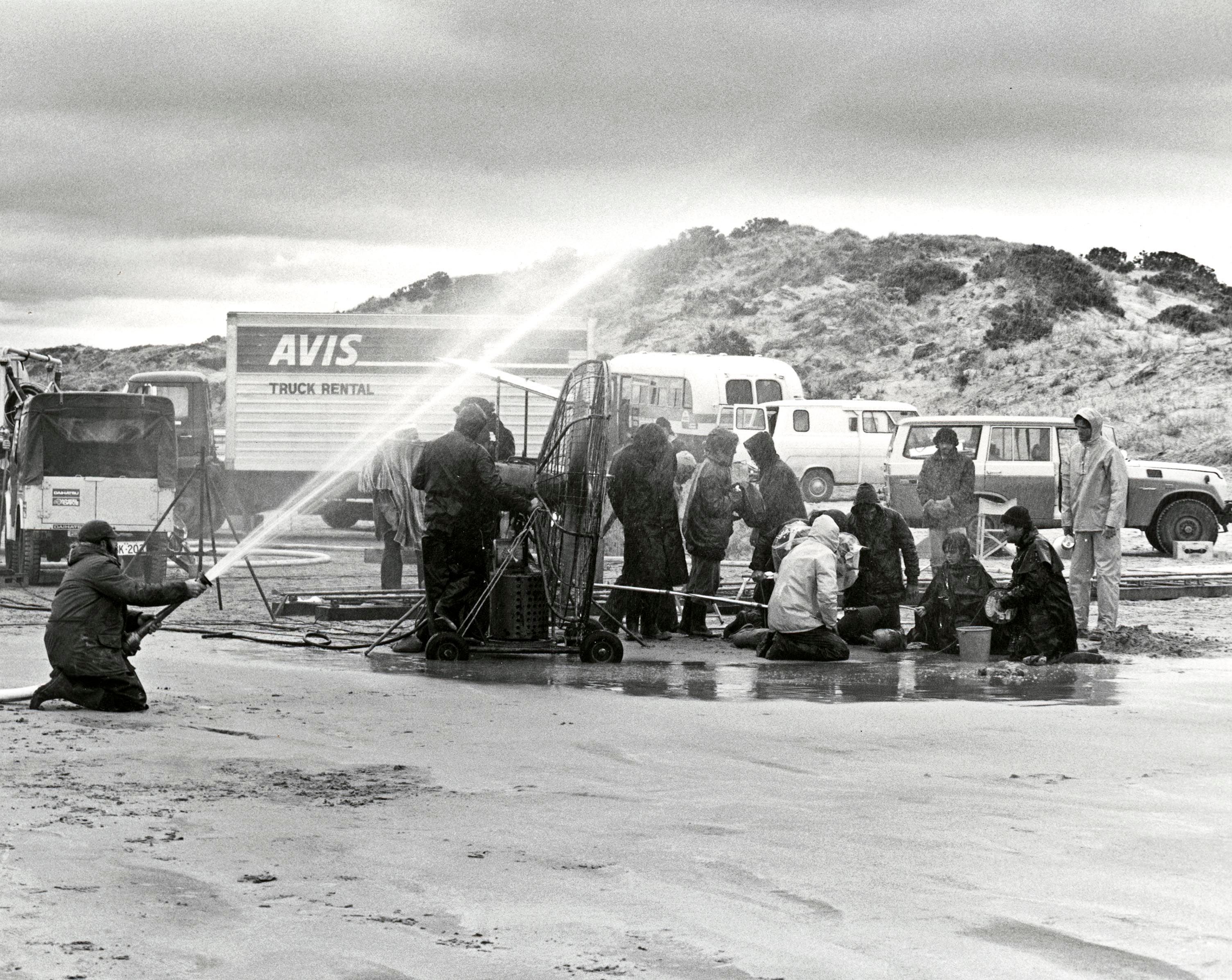 Making rain: behind the scenes of Storm Boy, with a hose connected to an off-camera water truck, a wind machine in the centre used to heighten storm effects, an Avis truck in the background which was used to haul heavy duty equipment, and cast and crew wrapped in oilskins in an attempt to keep dry.