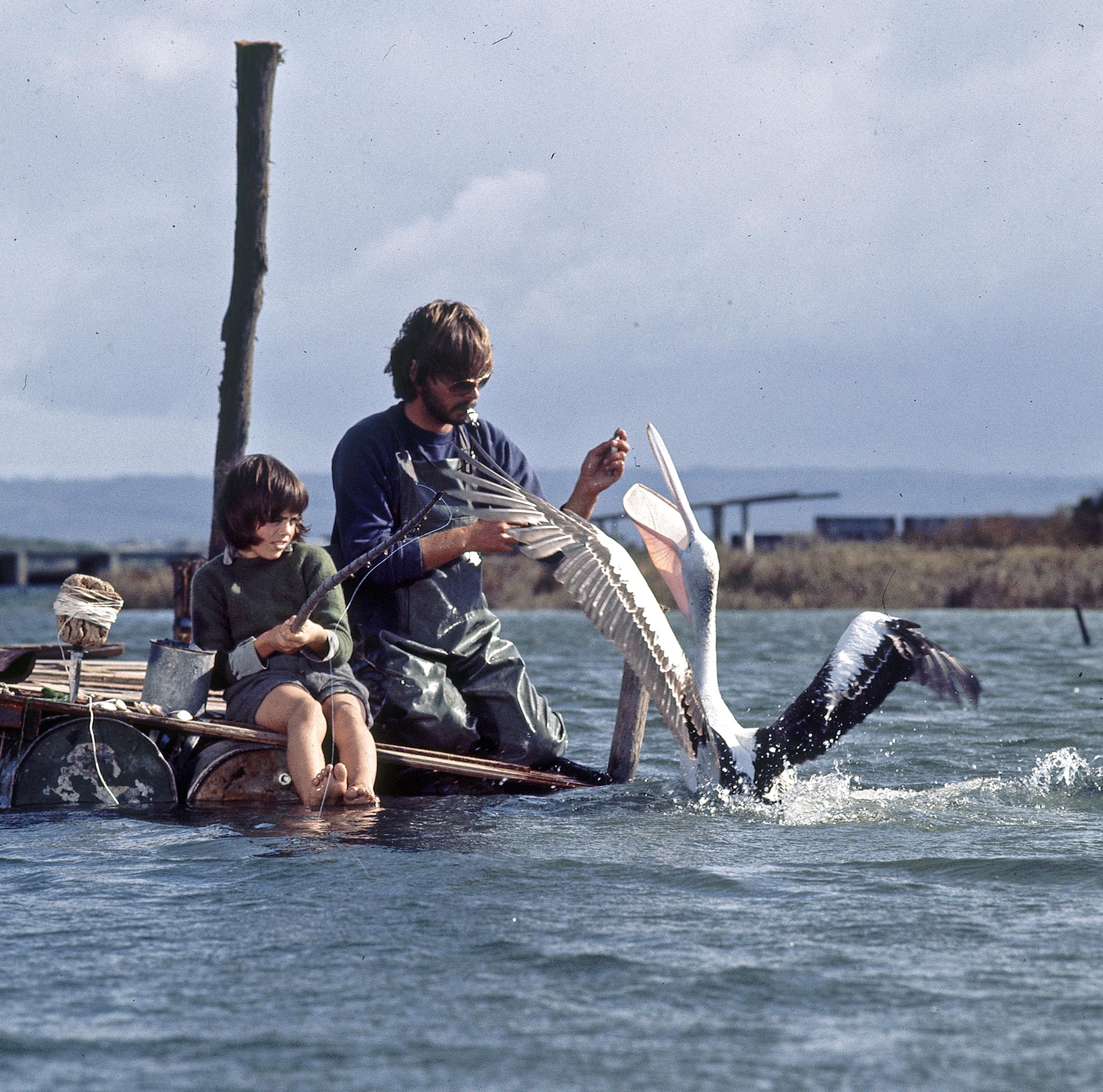 Storm Boy - nervous Greg Rowe, Gordon Noble and pelican production still