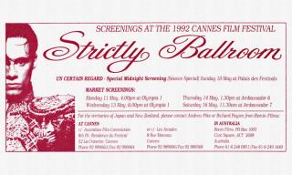 An invitation card with details of the screening details for Strictly Ballroom at the Cannes Film Festival in May 1992.