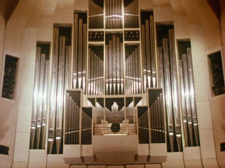 British organist and composer Peter Hurford plays the instrument which the reporter says will be completed in two to three years. Ultimately the organ took Ronald Sharp and others 10 years to complete.
