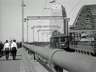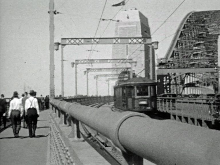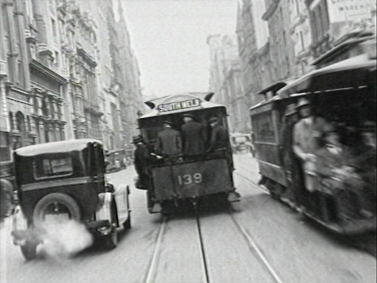 This silent black-and-white footage shows how the tram system in Sydney handles large crowds, including footage of the busy intersection at Anzac Parade Junction.