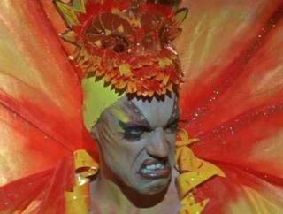 This mod-inspired costume consists of an arrangement of thongs and clever colour choice, and features Chanel gold-linked chain detailing. Due to a tight budget, costume designer Tim Chappel called on his mother's staff discount at Target to buy the materials for a total sum of $7.00!