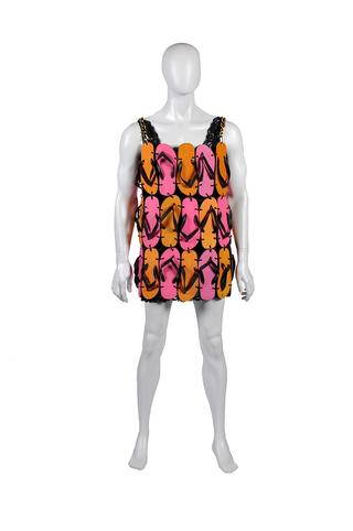 'The Thong Dress' was one of the most memorable costumes from The Adventures of Priscilla, Queen of the Desert. The pink, orange and black mini-dress is made of rubber thongs, and was worn by Hugo Weaving (Anthony 'Tick' Belrose, AKA Mitzi Del Bra).
