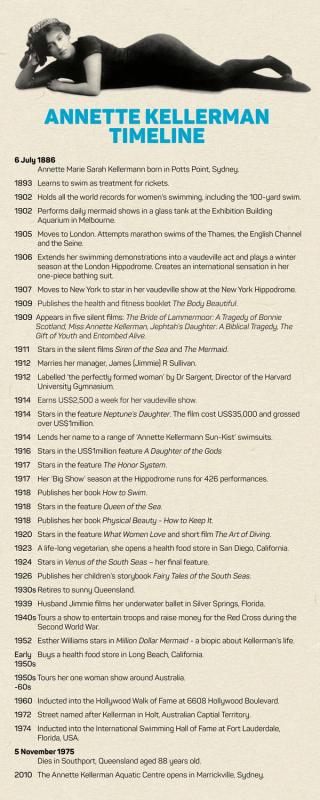 A timeline of Annette Kellerman's life and legacy, from her birth in 1886 to her death in 1975, and beyond.