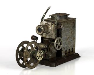 This little toy projector takes only 100-foot reels of 35mm film, but what's surprising is how dangerous it was. When it was made, 35mm film stock was madr from highly flammable nitrate. While prized for its luminous tones, nitrate was eventually banned owing to the risks involved in screening and storing it. It's strange now to imagine something so flammable being included in a children's toy.