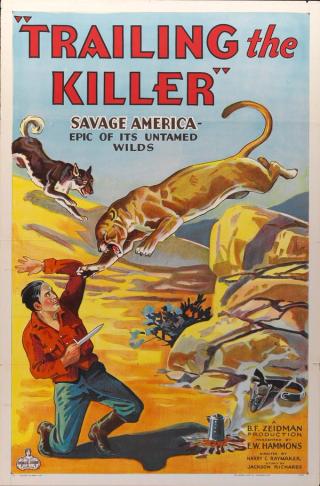 Full colour poster, cream border. Main image is illustration of a man kneeling on ground armed with dagger defending himself against a mountain lion, Lobo the dog is jumping in from background left. Film title in red and black text at top of poster. Main credits in black text at the bottom right corner of image -- General note: Printed by Morgan Litho Co, Cleveland USA. -- Lobo the dog, was played by 'Caesar', an Australian german shepherd.