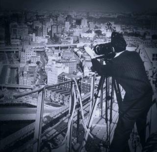 A cameraman filming the cruise ship R.M.S. Oriana from the top of the Sydney Harbour Bridge. The Oriana is docked at the international terminal at West Circular Quay.