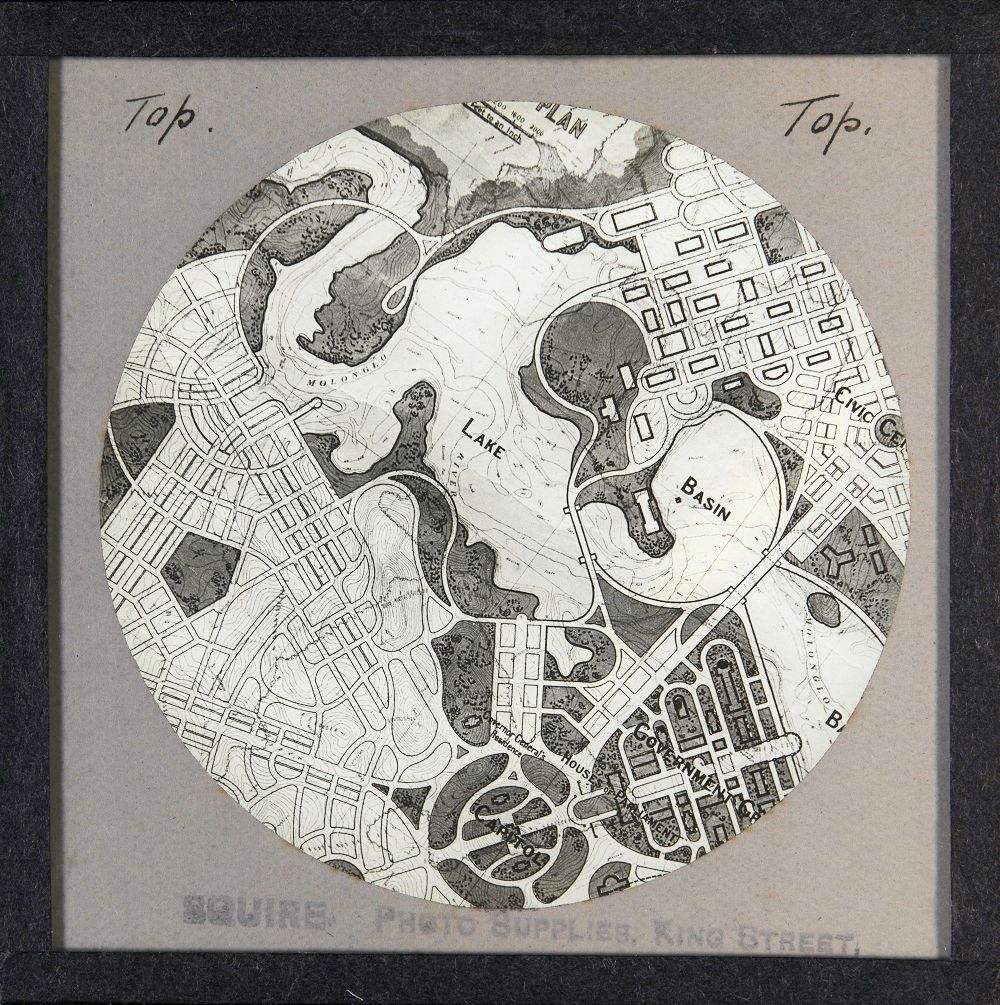 One of three black-and-white slides showing close-ups of a section of Walter Burley Griffin's Preliminary Plan.