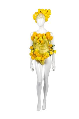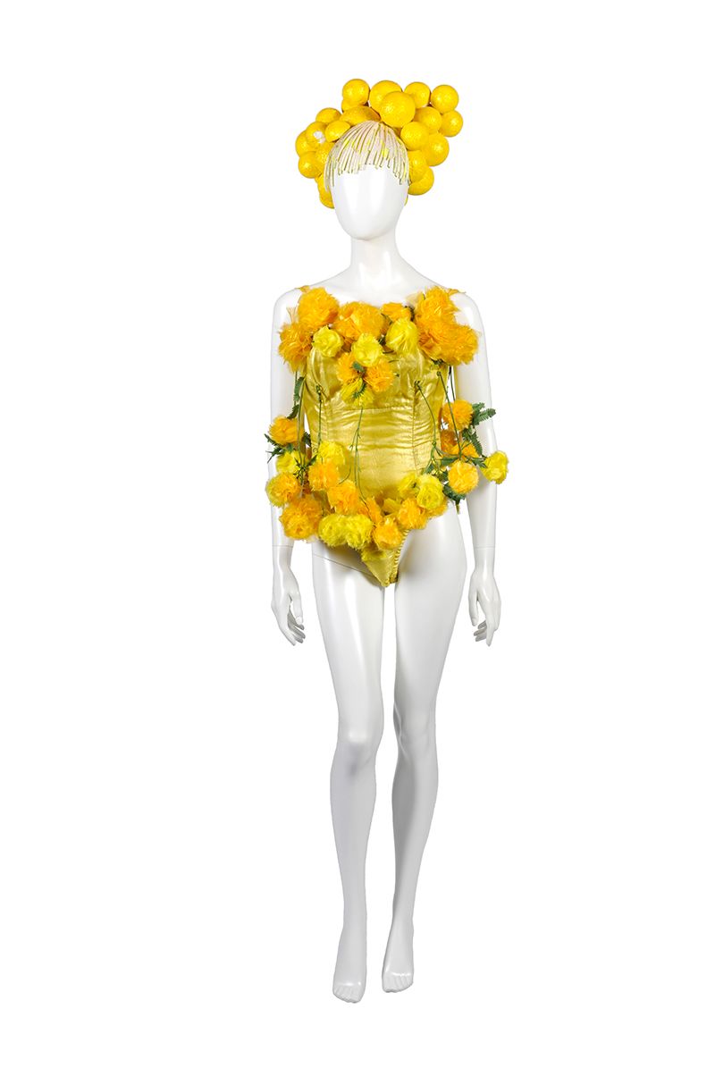 The unique costume comprises a lined golden G-string leotard, covered with plastic green foliage and tulle yellow and gold pom poms to replicate wattle. It was designed by Tim Chappel and Lizzy Gardiner.