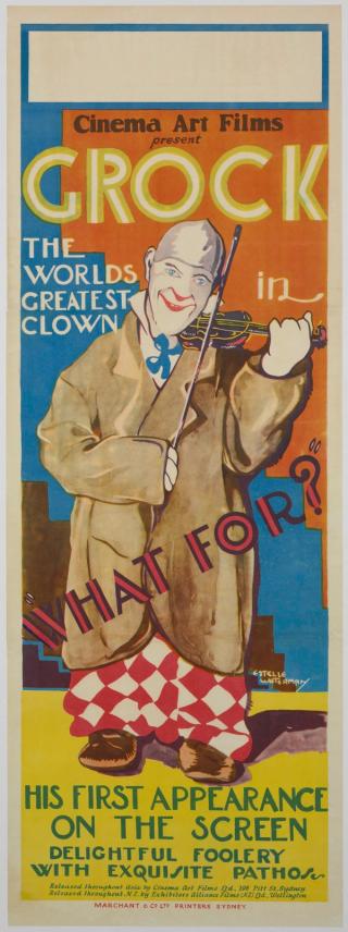 This is one of two clown-focused cinema posters in the Cinema Art collection. At first glance you could be excused for thinking this film is titled Grock rather than its actual title, What For? This is intentional. Grock, born Charles Adrien Wettach, was a Swiss clown, composer and musician. Wettach was once called ‘the king of clowns’ and ‘the greatest of Europe's clowns’ and was the most highly paid entertainer in the world. So it is not at all surprising his name and image dominate the poster.