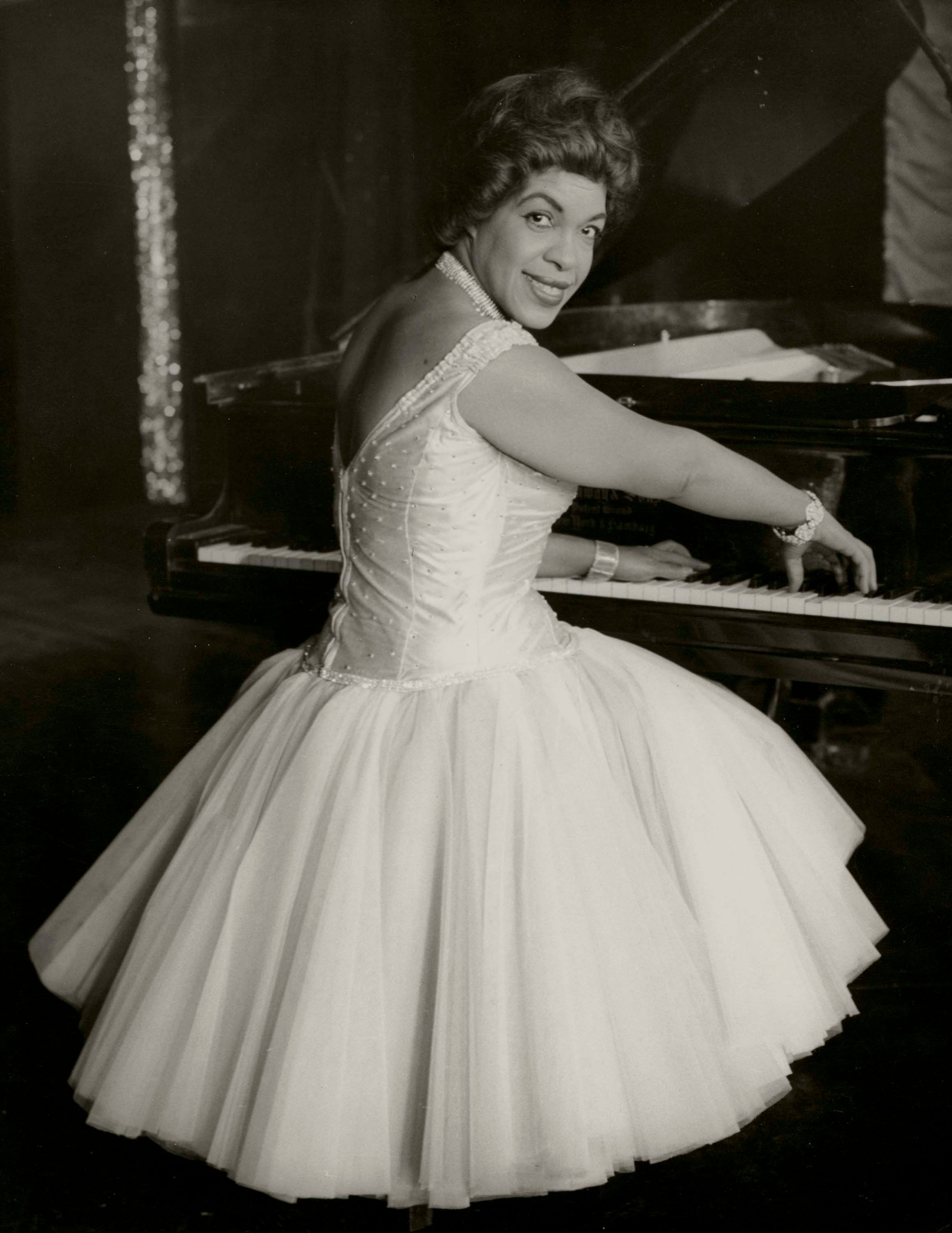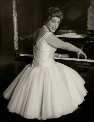 Publicity shot of Winifred Atwell seated at the piano and turning to face the camera, date unknown.