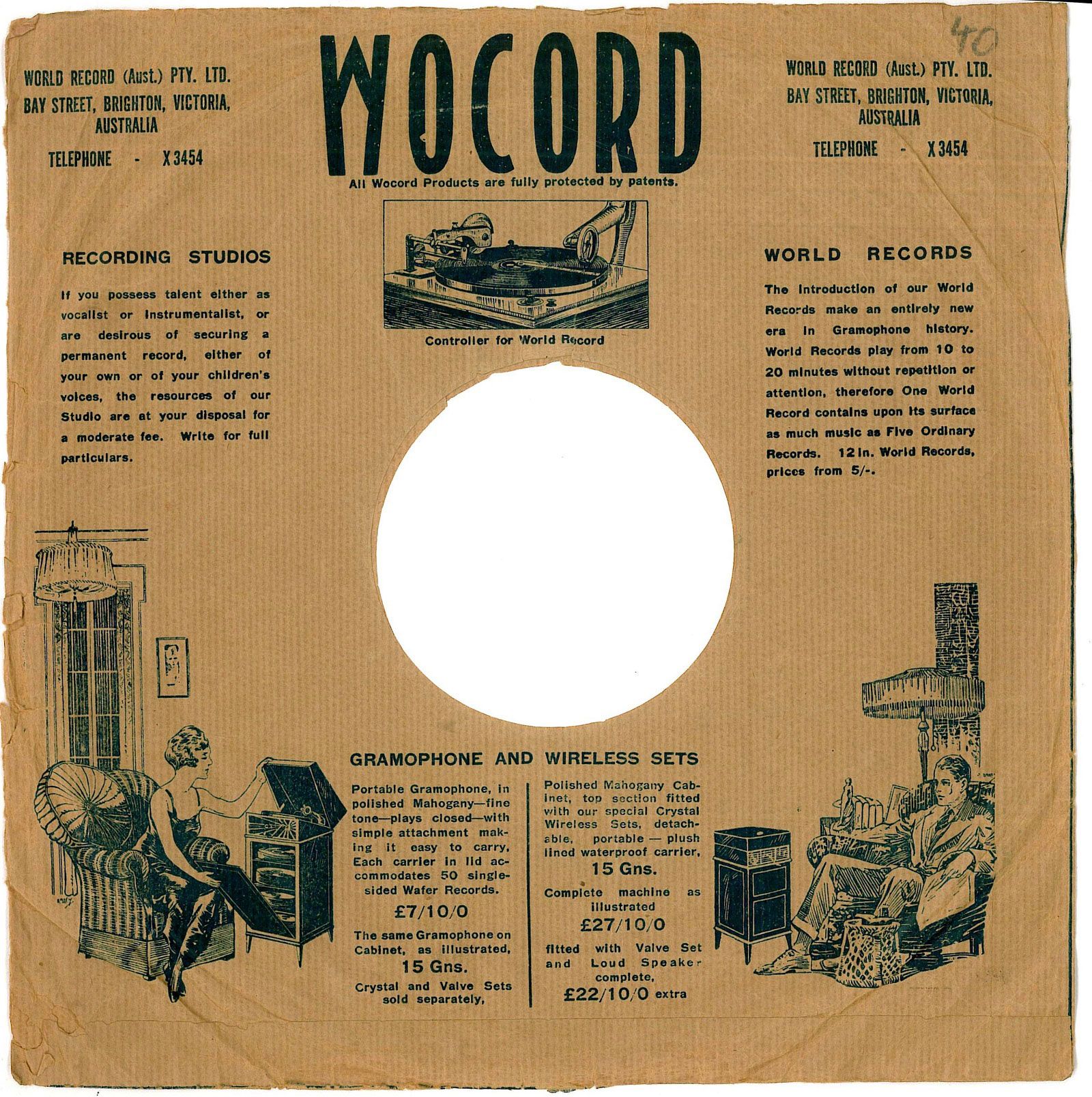 The introduction of our wolrd records make an entirely new era in gramophone history. World Records play from 10 to 20 minutes without repetition or attention, therefore one World Record contains upon its surface as much music as five ordinary records. 12 inch world Records, prices from 5/-.