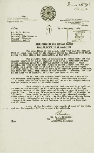 Most Hurley biographers have written in detail of his successful Australian tour lecturing in 1919 with In the Grip of the Polar Ice, his own cut of Shackleton’s Imperial Trans-Antarctic Expedition footage. Philip Ayres’s 1999 biography of Mawson also describes Hurley and Mawson’s correspondence on the 1931 sound re-release of the British Australian, New Zealand, Antarctic Research Expedition (BANZARE) film Siege of the South. The commercial failure of the film was another source of irritation between Mawson and Hurley for the remainder of both men’s lives.