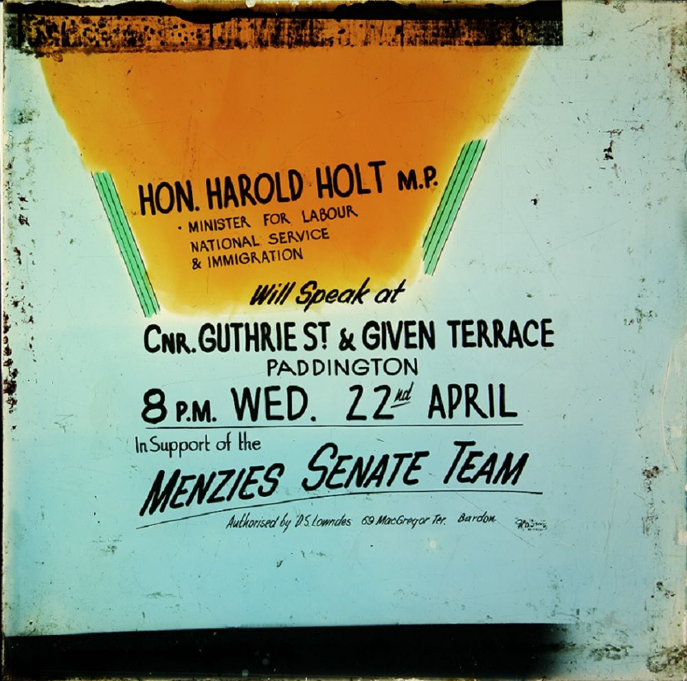 These slides also represent contrasting careers in Australian politics, candidates who flourished or floundered. Norman Leven (see Gallery 2: slide 4) was unsuccessful in his attempts to win the seat of Macquarie in both the 1955 and 1958 elections while Harold Holt (see Gallery 2: slide 5) progressed from his role as Minister for Labour, National Service and Immigration to eventually become prime minister.