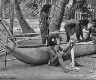 Main image: Four men building a canoe among the palm trees, from Pearls and Savages (Frank Hurley, 1921). NFSA title: 601126.