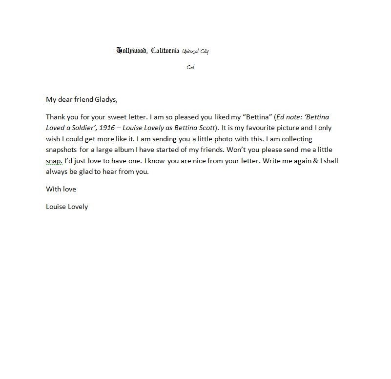 The NFSA recently acquired two signed photographs of Louise Lovely and a letter of hers responding to a fan in 1916.