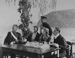 Eva Novak sitting outside at a table with four unidentified males in a still from For The Term of His Natural Life. NFSA title: 348990