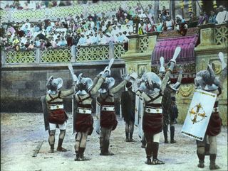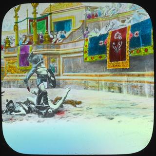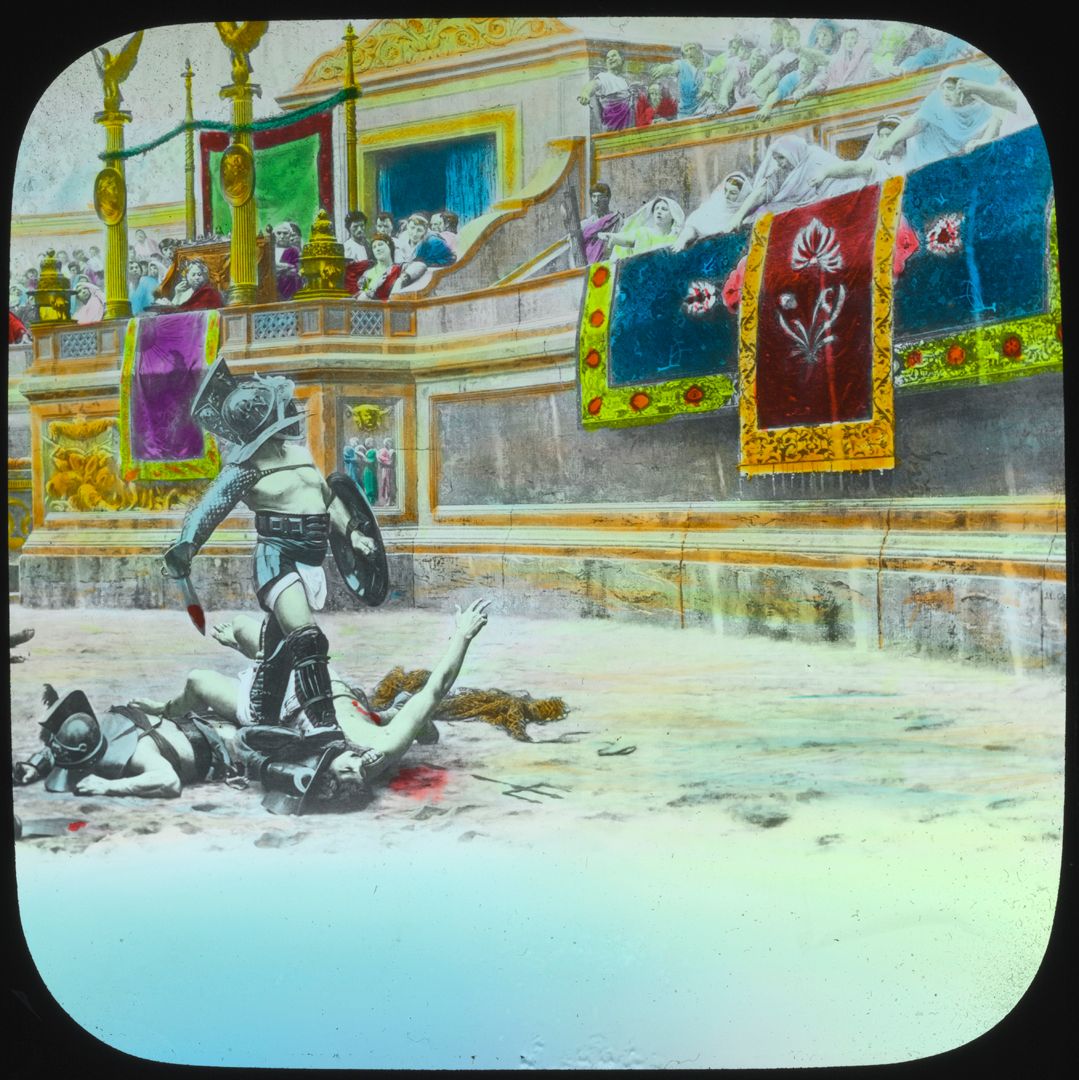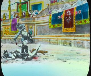 A glass slide in the NFSA’s Soldiers of the Cross set; a photographic copy on glass of a black and white reproduction of Jean Léon Gérome’s original 1872 painting Thumbs Down. This copy was then coloured by hand.