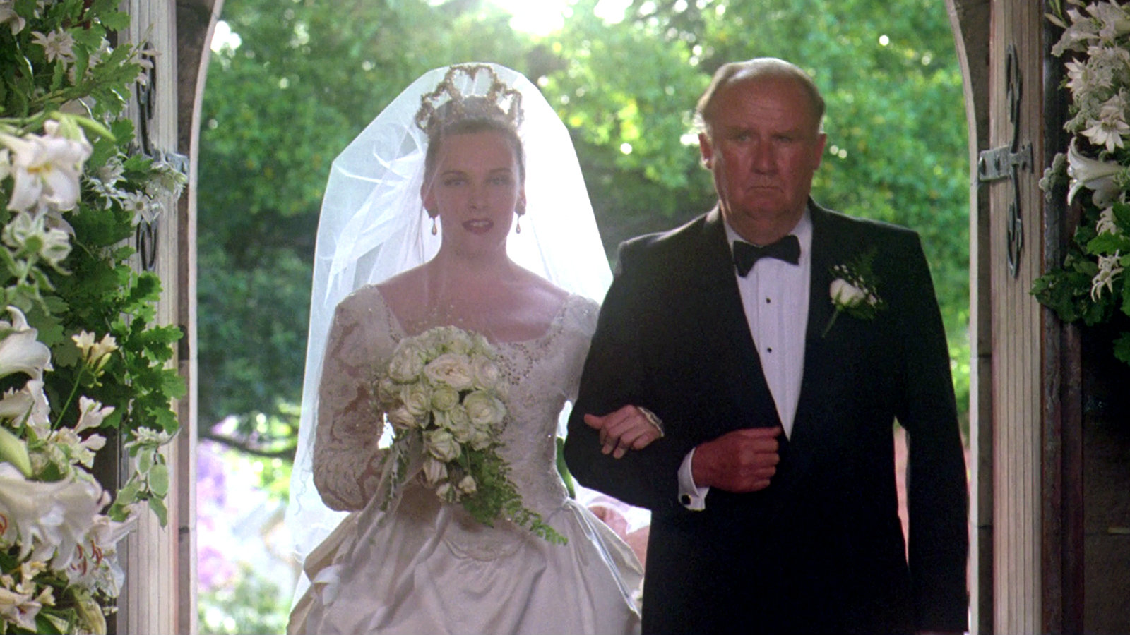 The pink bridesmaid dresses and accessories worn at the start of Muriel's Wedding (PJ Hogan, Australia, 1994), during the wedding of Tania (Sophie Lee).