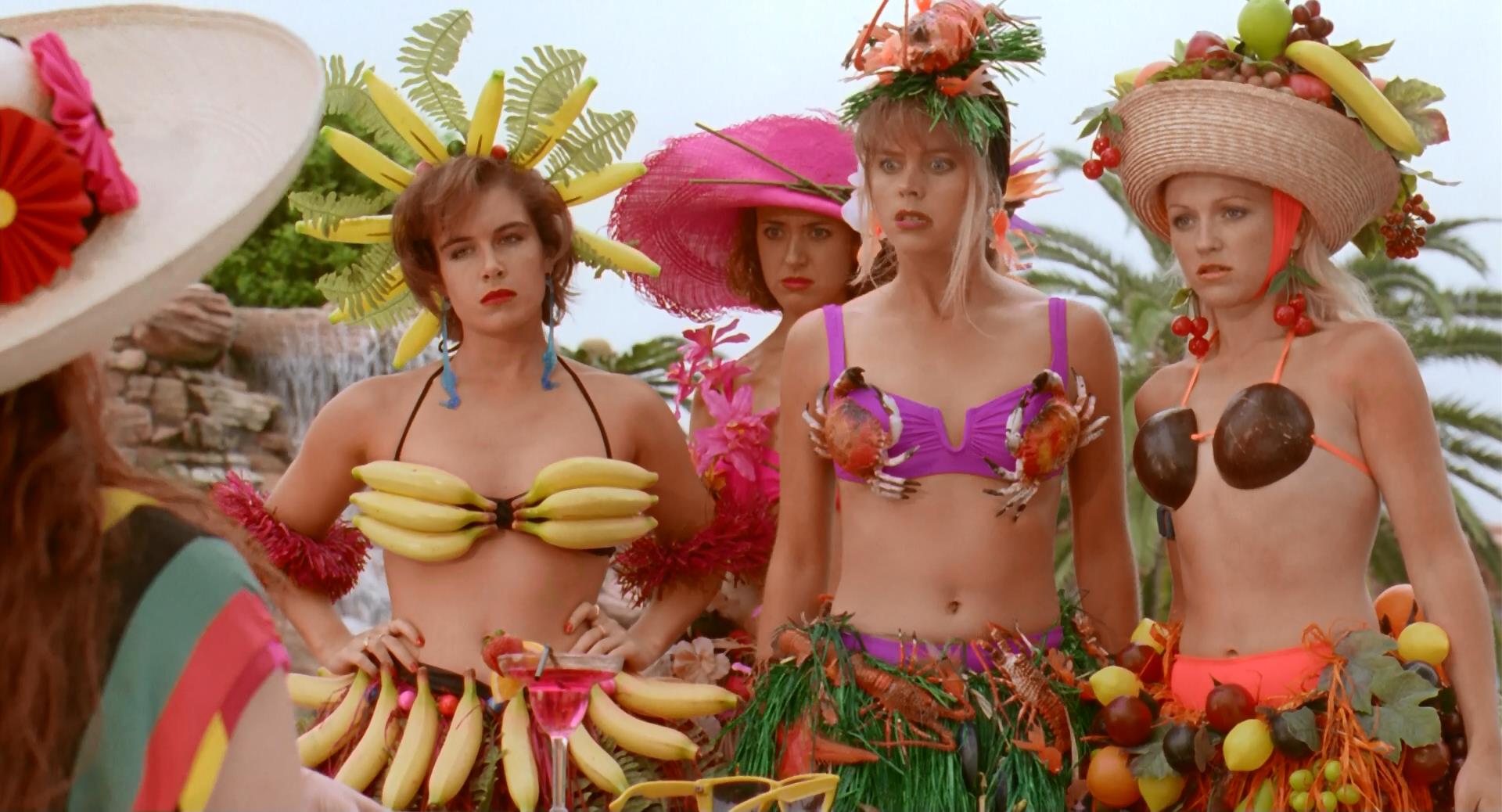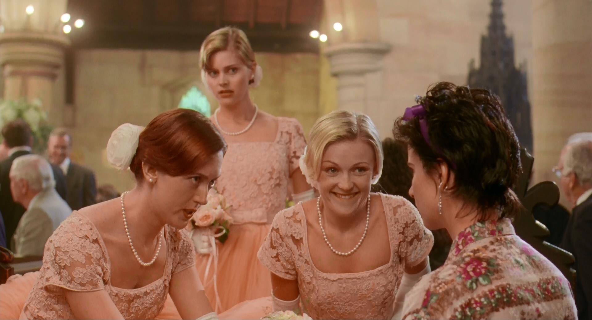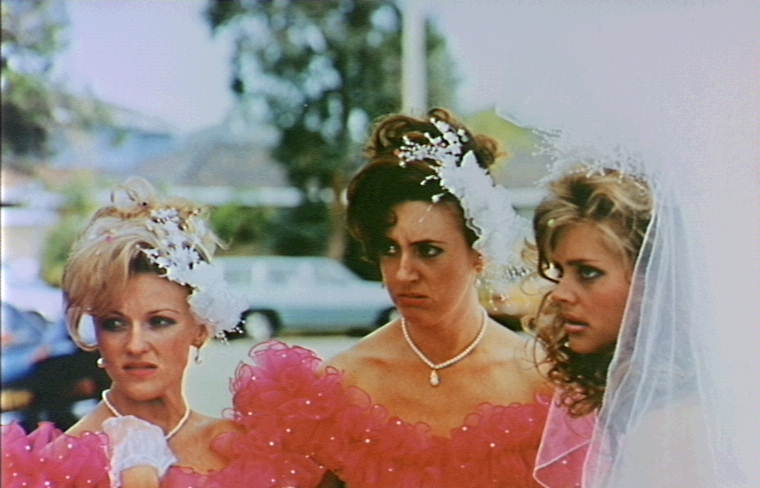 The three peach-coloured bridesmaids’ ensembles were worn by Cheryl (Rosalind Hammond), Tania (Sophie Lee) and Janine (Belinda Jarrett) at Muriel’s wedding.